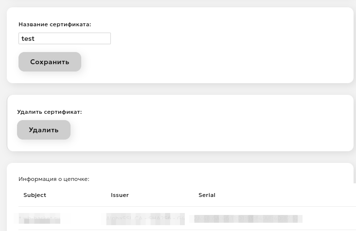 При клике на название сертификата можно перейти на страницу с детальной информацией о цепочке (поля Subject, Issuer, Serial, Fingerprint, From, Till по каждому из сертификатов цепочки). На этой странице также возможно поменять название сертификата (ввести новое название в поле ввода и нажать кнопку "Сохранить") или удалить сертификат (нажать кнопку "Удалить" и подтвердить действие во всплывающем окне).