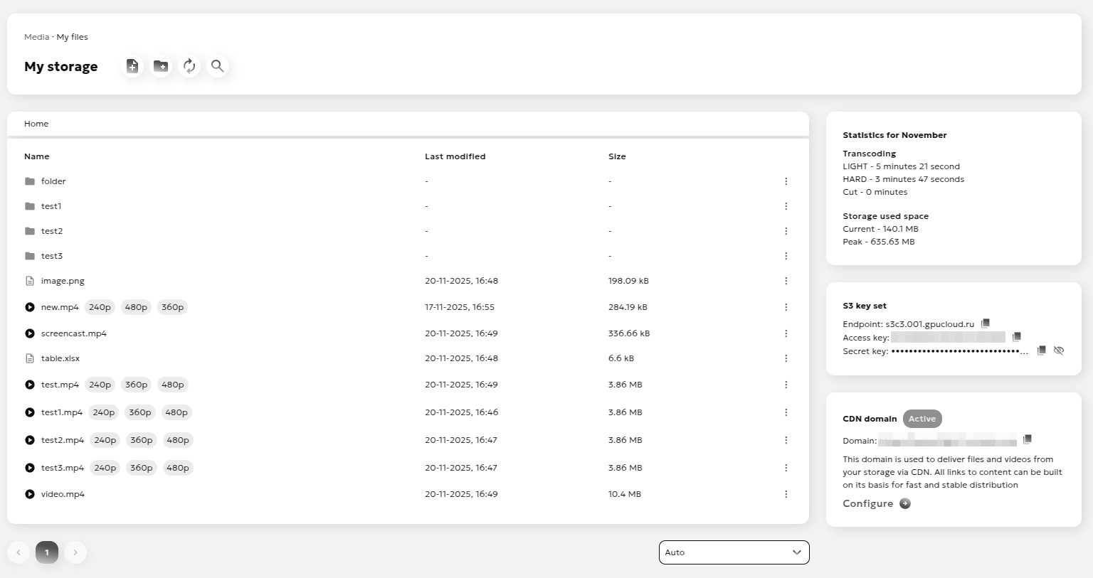 The "Storage" service allows you to store any files and work with mp4 video files.